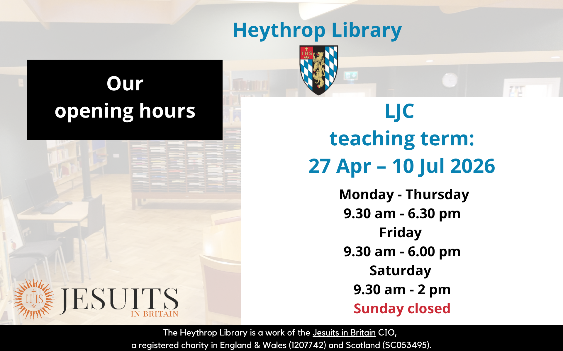 From Monday 27 April we will be open for longer again, to support the teaching and learning at the London Jesuit Centre:
